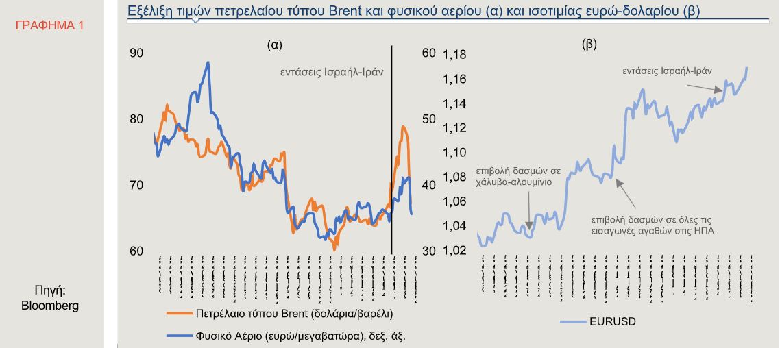Η τιμή του πετρελαίου Brent, αν και κατά τη διάρκεια της ημέρας στις 23 Ιουνίου έφθασε να διαπραγματεύεται στα 81 δολάρια/βαρέλι, κινήθηκε έκτοτε πτωτικά κλείνοντας στις 25 Ιουνίου στα 67,7 δολάρια/βαρέλι, χαμηλότερα σε σύγκριση με την έναρξη των εχθροπραξιών. Το φυσικό αέριο αντίστοιχα έκλεισε στις 25 Ιουνίου στα 35,5 ευρώ/μεγαβατώρα έχοντας μειωθεί κατά 2% στο ίδιο χρονικό διάστημα (Γράφημα 1α). Αμφότερες οι τιμές παραμένουν σε χαμηλότερα επίπεδα από την αρχή του έτους, υπό το βάρος των ανησυχιών για περιορισμό της ζήτησης και επιβράδυνση της παγκόσμιας οικονομίας, ως απόρροια του εμπορικού πολέμου. Όπως προαναφέρθηκε, το ενδεχόμενο εκ νέου ανόδου των τιμών της ενέργειας ως αποτέλεσμα της διατάραξης της προσφοράς ενέργειας αλλά και η αύξηση του κόστους μεταφοράς, θα μπορούσε να οδηγήσει σε νέα αναζωπύρωση του πληθωρισμού και επακόλουθα περαιτέρω διεύρυνση του εμπορικού ελλείμματος της Ελλάδας.