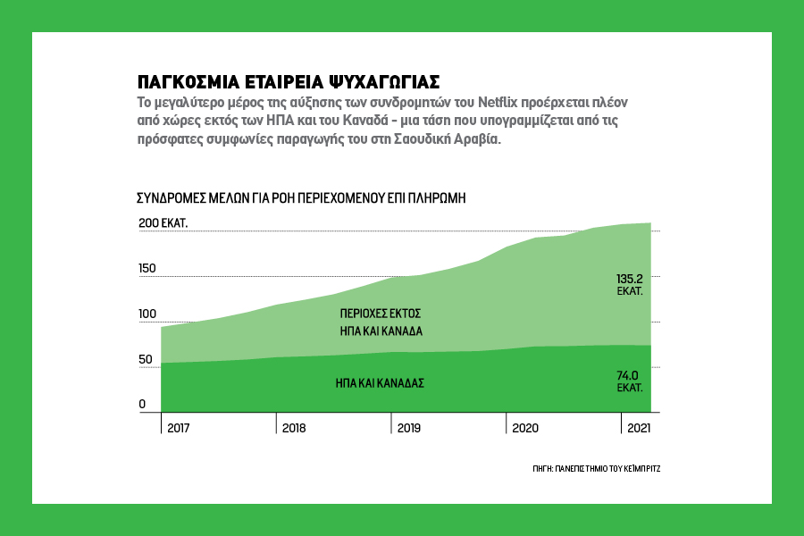 Λίγες εταιρείες κινούνται πιο επιθετικά από το Netflix, τη µεγαλύτερη πλατφόρµα ροής περιεχοµένου στον κόσµο, η οποία κάνει το ντεµπούτο της στη λίστα Fortune Global 500 φέτος. Με περισσότερους από 209 εκατοµµύρια συνδροµητές σε περίπου 190 χώρες, έχει απαράµιλλη εµβέλεια και εκ των πραγµάτων τεράστια επιρροή σε ό,τι αφορά τον τρόπο µε τον οποίο «βλέπει» ο κόσµος τη Σαουδική Αραβία, ενώ παρέχει στους δηµιουργούς περιεχοµένου πρόσβαση στο πλουσιότερο κοινό στον αραβόφωνο κόσµο. «Η οικονοµία της σαουδαραβικής ψυχαγωγίας είναι ένα απέραντο, γόνιµο έδαφος για τη νεολαία, µε εκπληκτική καταναλωτική δύναµη» λέει ο Sam Blatteis, διευθύνων σύµβουλος της The MENA Catalysts, µιας εταιρείας διακυβερνητικών σχέσεων µε έδρα το Ντουµπάι, που παρέχει συµβουλευτικές υπηρεσίες στις αµερικανικές επιχειρήσεις τεχνολογίας οι οποίες εισέρχονται στη σαουδαραβική αγορά.