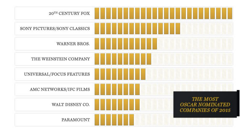 Στο μεταξύ οι ταινίες της Sony, που φέτος έγινε πρωτοσέλιδο για τους λάθος λόγους (την παραβίαση των υπολογιστών της από χάκερς), συγκέντρωσαν 15 υποψηφιότητες (μεταξύ των οποίων οι Whiplash και Foxcatcher). Στην τρίτη θέση η Warner Bros με 11 υποψηφιότητες, ανάμεσα στις οποίες το American Sniper του Κλιντ Ίστγουντ.