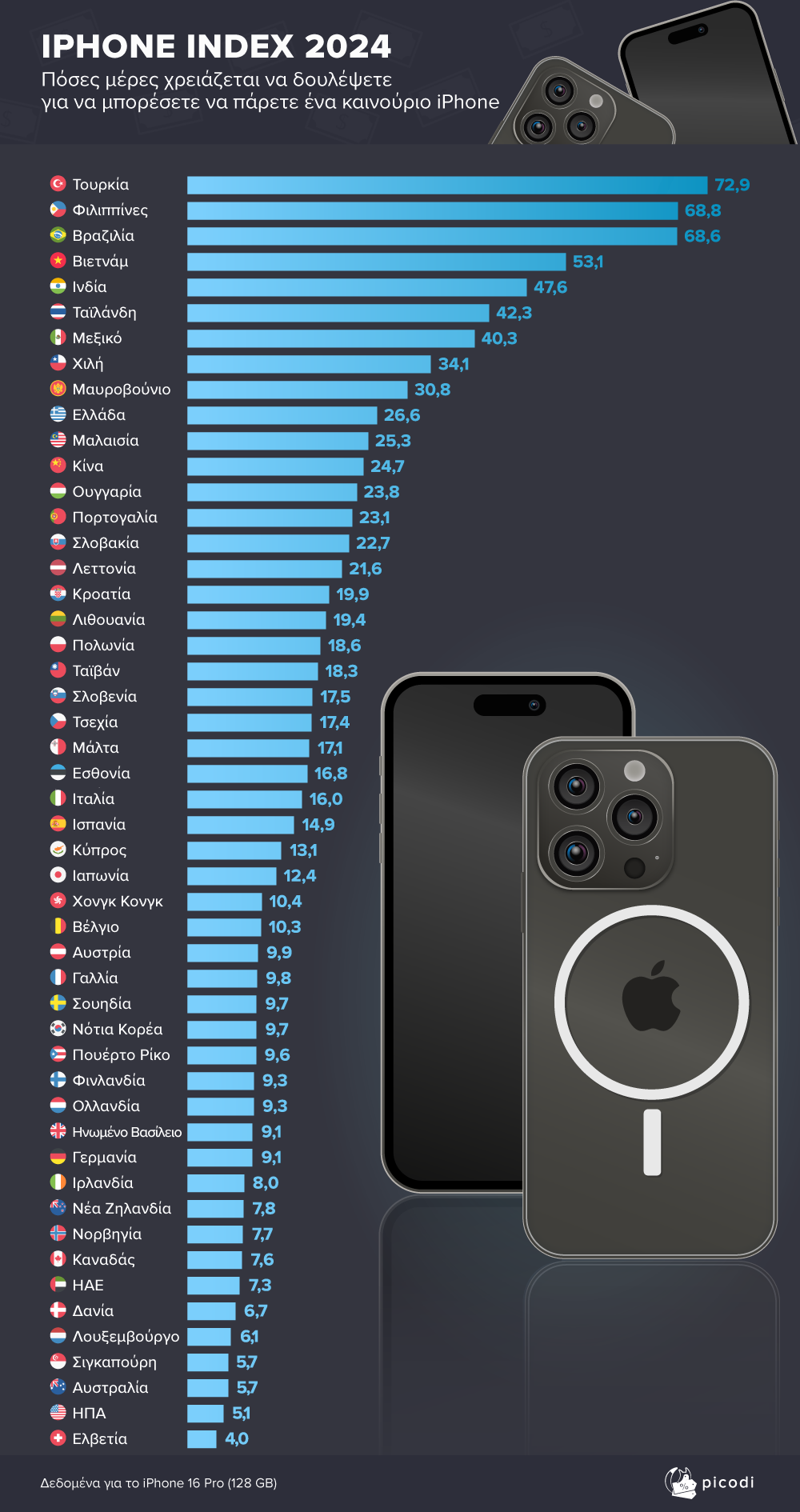 Η Picodi.com πραγματοποίησε και φέτος την Έρευνα iPhone Index, η οποία συγκρίνει τις τιμές του νεότερου iPhone σε διάφορες χώρες με τους μέσους μισθούς.