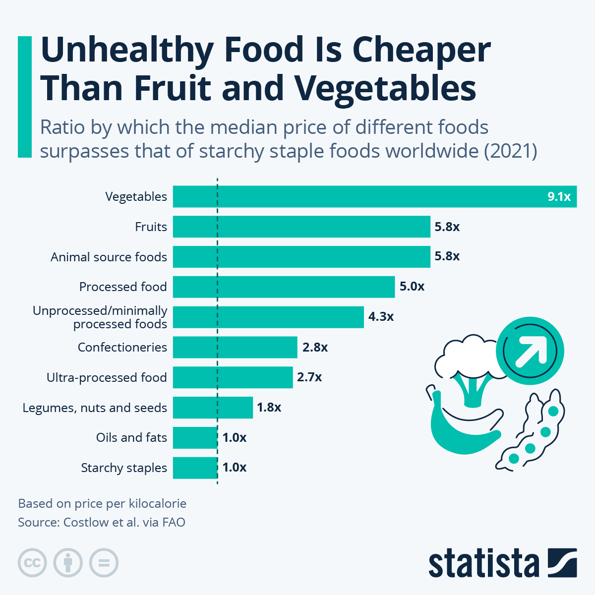 Σύμφωνα με τα τελευταία διαθέσιμα στοιχεία του 2021, τα λαχανικά ήταν κατά μέσο όρο εννέα φορές ακριβότερα από βασικά αμυλούχα τρόφιμα, ενώ ο ίδιος αριθμός θερμίδων μπορούσε να αποκτηθεί μέσω υπερ-επεξεργασμένων τροφίμων ή γλυκισμάτων με μόνο 2,7-2,8 φορές το κόστος.