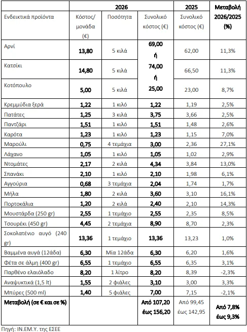 Σύγκριση εκτιμήσεων κόστους (σε € και σε %) πασχαλινού τραπεζιού 2026 & 2025
