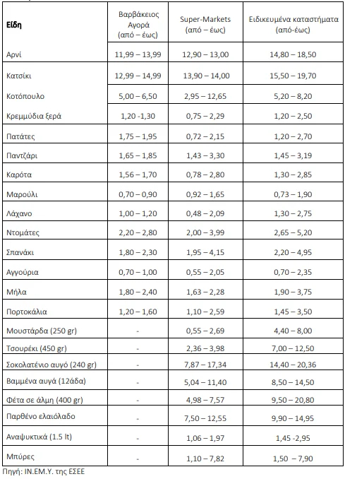 Σύμφωνα με την έρευνα, το εύρος των τιμών δικαιολογείται από την καταγραφή σειράς προϊόντων διαφορετικής ποιότητας, σε αρκετές τοπικές αγορές και διαφορετικούς τύπους καταστημάτων. Επιπρόσθετα, διευκρινίζεται ότι οι τιμές των προϊόντων που εμφανίζονται στους παρακάτω πίνακες είναι ενδεικτικές και επιχειρούν να χαρτογραφήσουν τη γενική κατανομή τιμών και την εικόνα της αγοράς.