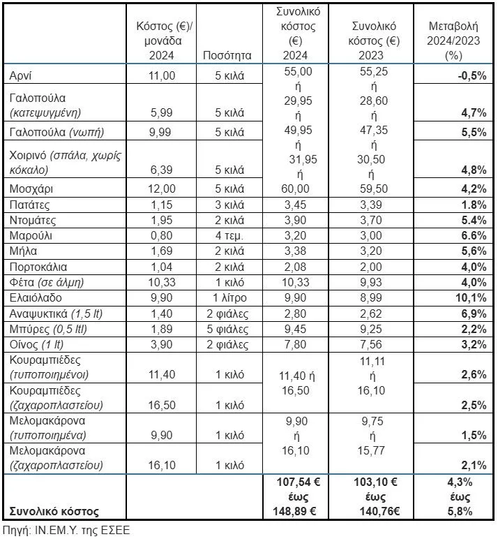 Το Ινστιτούτο Εμπορίου και Υπηρεσιών της Ελληνικής Συνομοσπονδίας Εμπορίου και Επιχειρηματικότητας (ΙΝ.ΕΜ.Υ.-ΕΣΕΕ), εκτίμησε το κόστος του χριστουγεννιάτικου τραπεζιού για το 2024 σύμφωνα με την πάγια πρακτική του. Καταγράφηκαν, με επιτόπια τιμοληψία και συνεντεύξεις με key-informers της αγοράς, οι τιμές τόσο από αλυσίδες Supermarkets όσο και από ειδικευμένα καταστήματα λιανικής (πχ ζαχαροπλαστεία/ κρεοπωλεία κτλ), καθώς και από τη Βαρβάκειο αγορά.