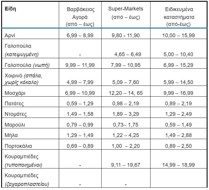 Το εύρος των τιμών δικαιολογείται από την καταγραφή σειράς προϊόντων διαφορετικής ποιότητας, σε αρκετές τοπικές αγορές και διαφορετικούς τύπους καταστημάτων. Επιπρόσθετα, διευκρινίζεται ότι οι τιμές των προϊόντων που εμφανίζονται στους Πίνακες (1 & 2) είναι ενδεικτικές και επιχειρούν να χαρτογραφήσουν τη γενική κατανομή τιμών και την εικόνα της αγοράς (βλ. μεθοδολογικό σημείωμα).