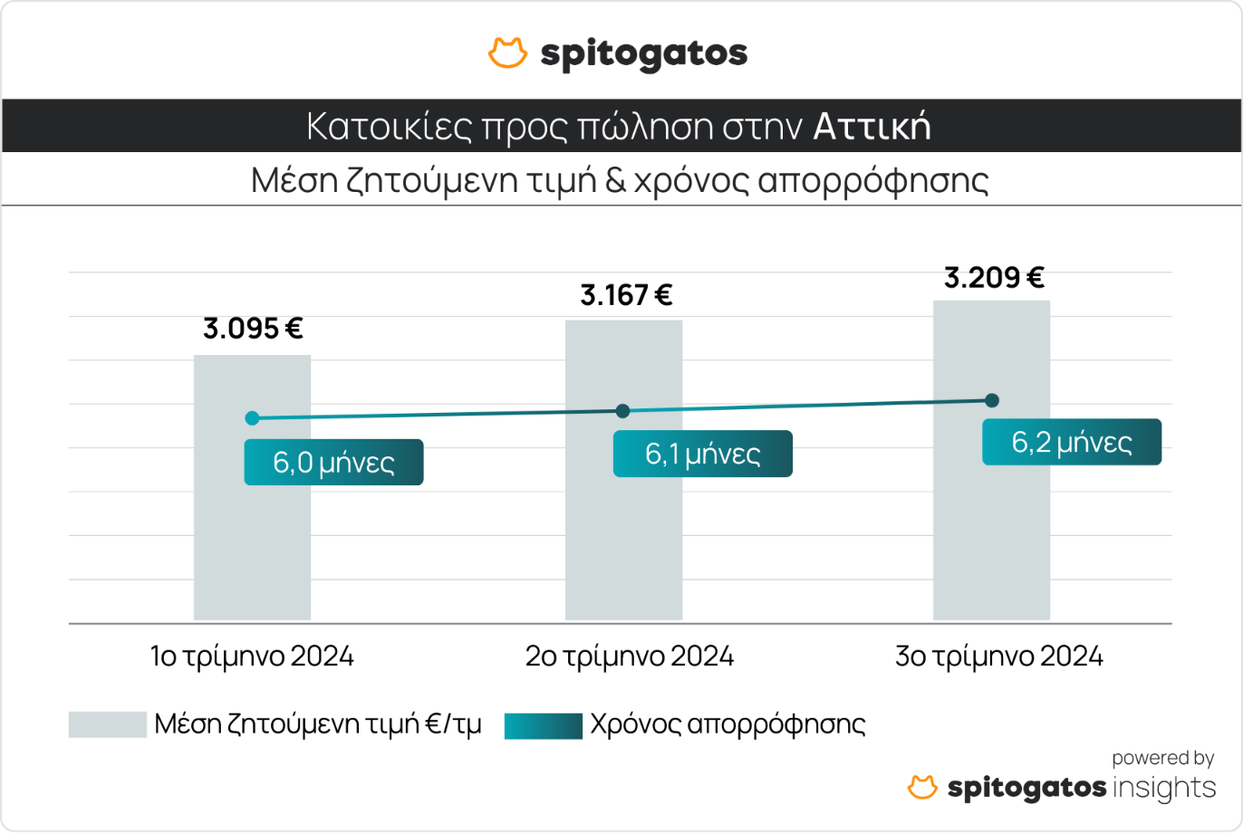Η Αθήνα και τα προάστιά της, καθώς και η Θεσσαλονίκη, συγκεντρώνουν το μεγαλύτερο ποσοστό του πληθυσμού της χώρας, γεγονός που αναδεικνύει ακόμη περισσότερο τη διαφορά μεταξύ προσφοράς και ζήτησης για κατοικίες προς πώληση σε αυτές τις περιοχές. Το ζήτημα αυτό απασχολεί τόσο όσους επιθυμούν να αποκτήσουν κατοικία, είτε μέσω του προγράμματος «Σπίτι μου 2» είτε ανεξάρτητα από αυτό, όσο και όσους ενδιαφέρονται να διαθέσουν τις κατοικίες τους στην αγορά. Εστιάζοντας στην περιοχή της Αττικής, παρατηρείται ότι κατά τα πρώτα τρία τρίμηνα του 2024 ο χρόνος απορρόφησης κατοικιών προς πώληση κυμαίνεται γύρω στους έξι μήνες.
