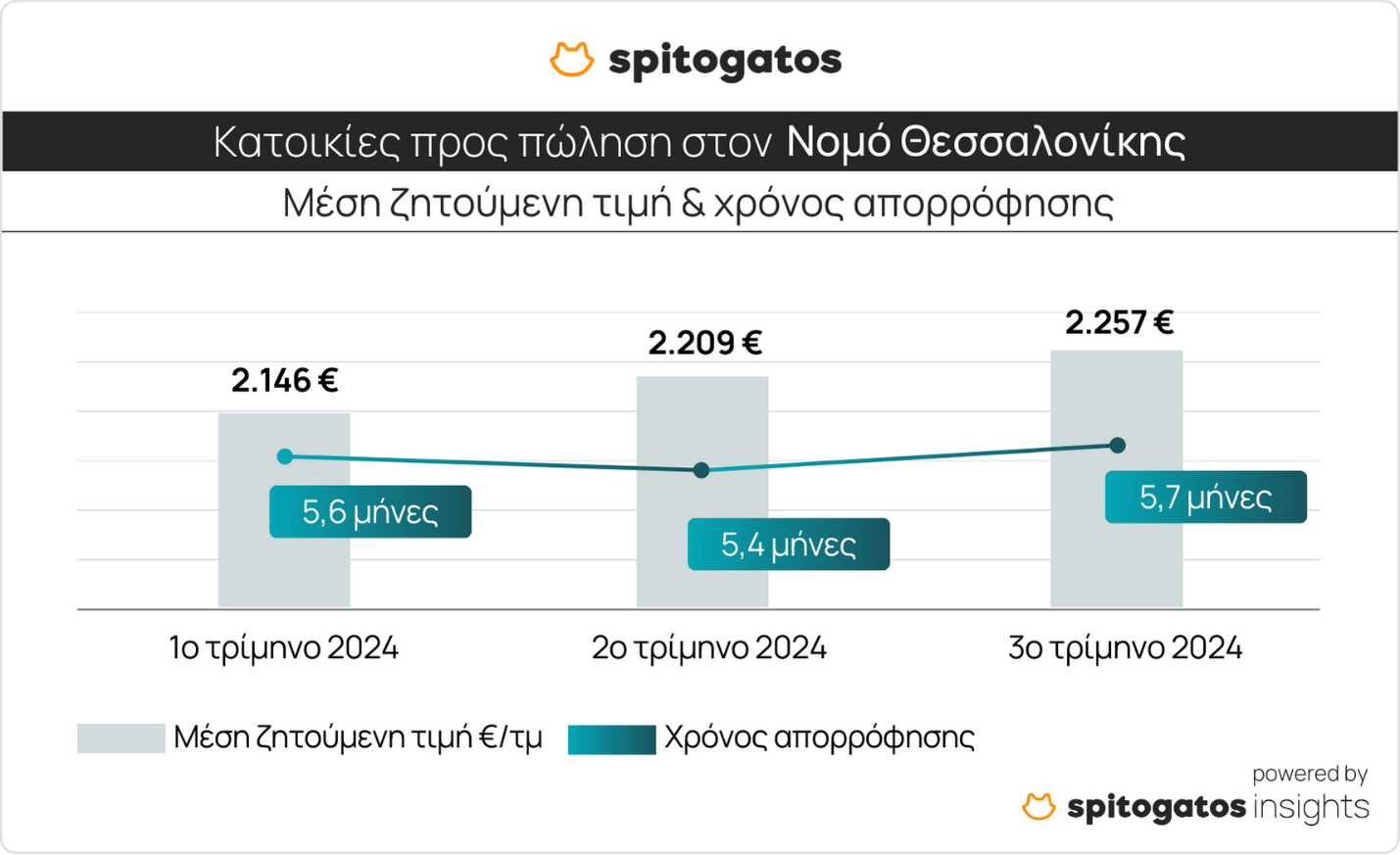 Στον Νομό Θεσσαλονίκης η εικόνα είναι λίγο διαφορετική. Ο ρυθμός απορρόφησης κατοικιών προς πώληση από την αγορά είναι ταχύτερος κατά περίπου 2 εβδομάδες σε σύγκριση με αυτόν της Αττικής. Συγκεκριμένα, το 3ο τρίμηνο του 2024 ο χρόνος απορρόφησης ανήλθε λίγο πάνω από τους 5,5 μήνες μετά από μικρές διακυμάνσεις τα προηγούμενα τρίμηνα του έτους. Τα Προάστια της Θεσσαλονίκης, που ανήκουν στον Νομό Θεσσαλονίκης, αποτελούν την πιο δημοφιλή περιοχή στην Ελλάδα για αγορά κατοικίας από εγχώριους αγοραστές που αναζητούν ακίνητα σύμφωνα με τον δείκτη ζήτησης SDI, ο οποίος βασίζεται στον όγκο αναζητήσεων της πλατφόρμας Spitogatos. Ο συνδυασμός αυτών των δεδομένων υπογραμμίζει τη μεγάλη ζήτηση για κατοικίες προς πώληση στον Νομό Θεσσαλονίκης.