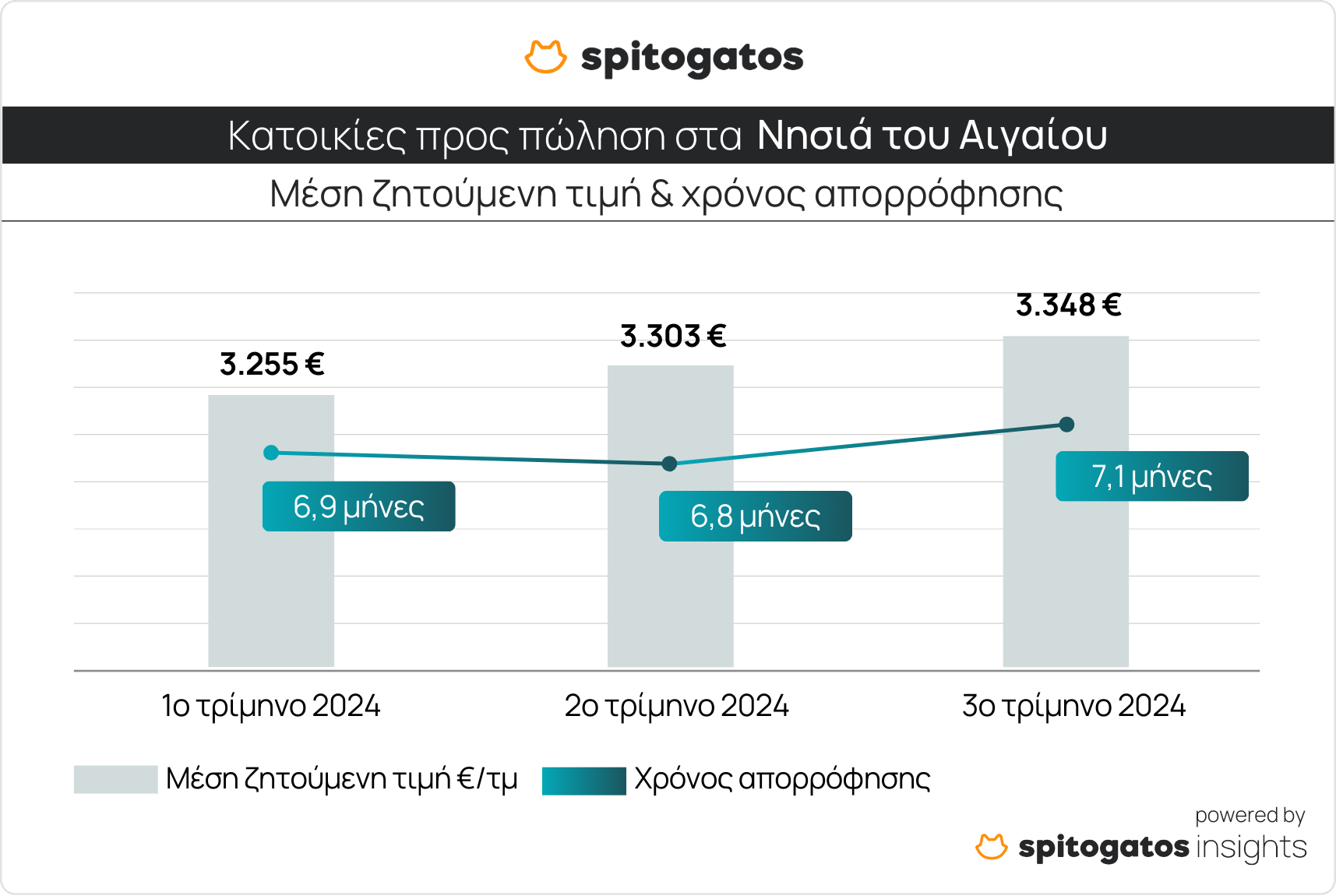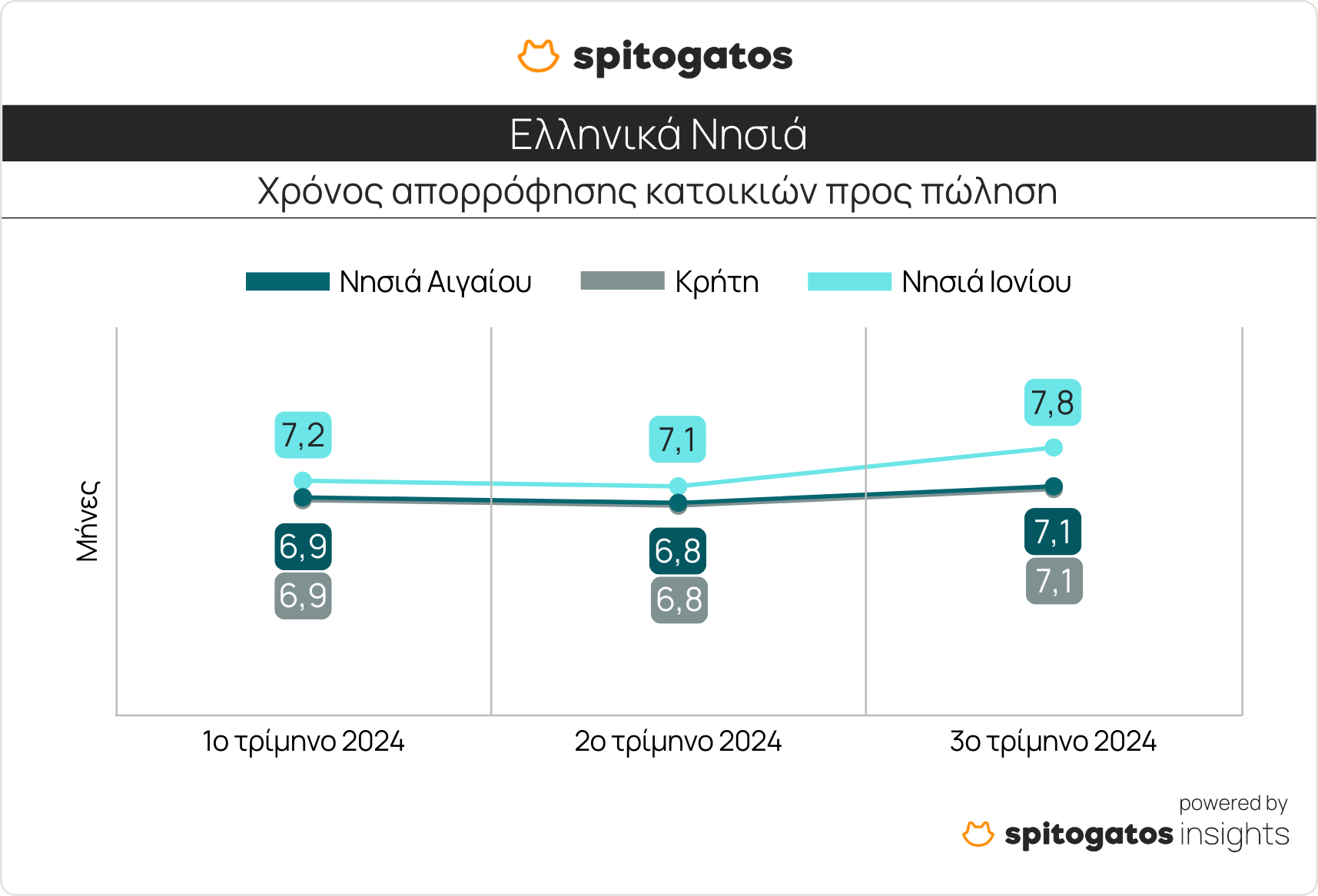 Στα Νησιά του Αιγαίου, ο χρόνος απορρόφησης κατοικιών προς πώληση κατά το 3ο τρίμηνο του 2024 ανέρχεται περίπου στους 7 μήνες, μετά από μικρές αυξομειώσεις τα προηγούμενα τρίμηνα. Επεκτείνοντας την ανάλυση σε όλα τα νησιά της Ελλάδας, διαπιστώνεται ότι οι κατοικίες προς πώληση σημειώνουν σχετικά χαμηλότερο ρυθμό απορρόφησης στα Νησιά του Ιονίου σε σχέση με τα Νησιά του Αιγαίου και την Κρήτη, φτάνοντας τους 7,8 μήνες κατά το 3ο τρίμηνο του 2024. Αντίστοιχα, τα Νησιά του Αιγαίου και η Κρήτη εμφανίζουν παρόμοιους χρόνους απορρόφησης των κατοικιών προς πώληση από την αγορά, οι οποίοι διαμορφώνονται στους 7 μήνες.