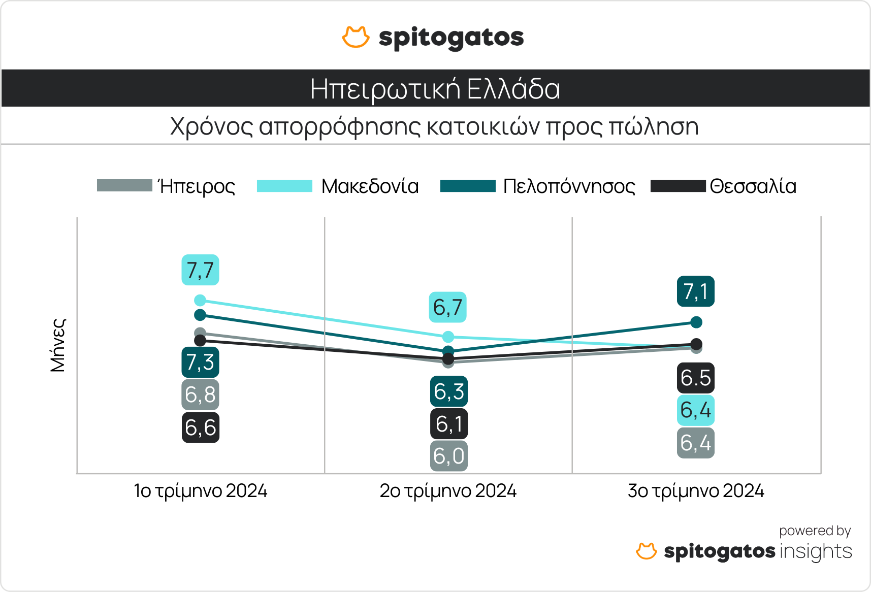 Σε ό,τι αφορά την ηπειρωτική Ελλάδα, χαμηλότερος είναι ο ρυθμός απορρόφησης κατοικιών προς πώληση κατά το 3ο τρίμηνο του 2024 στην Πελοπόννησο, ενώ ελαφρώς ταχύτερος είναι σε Μακεδονία και Ήπειρο, με τον χρόνο απορρόφησης να κυμαίνεται ελάχιστα πάνω από τους έξι μήνες κατά το τρίμηνο αυτό. Αυξητική είναι η πορεία του ρυθμού απορρόφησης κατοικιών προς πώληση στη Μακεδονία από το 1ο μέχρι το 3ο τρίμηνο του 2024 με τον χρόνο απορρόφησης κατοικιών προς πώληση να μειώνεται από τους 7,7 μήνες κατά το 1ο τρίμηνο, στους 6,4 το 3ο τρίμηνο του 2024.