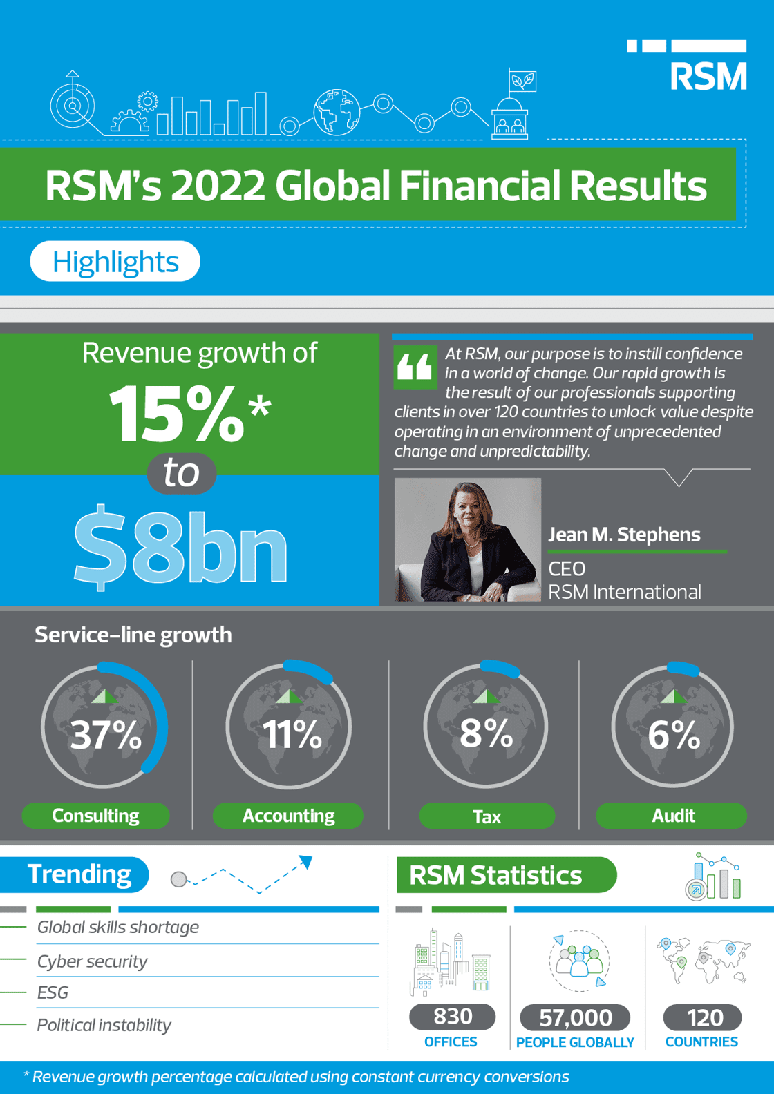 Η RSM, το 6ο μεγαλύτερο δίκτυο Ορκωτών Ελεγκτών Λογιστών και Συμβούλων Επιχειρήσεων, ανακοίνωσε συνολικά έσοδα 8 δισ. δολαρίων ΗΠΑ, γεγονός το οποίο αντιστοιχεί σε ανάπτυξη 15% για το 2022 παγκοσμίως. Για τρίτη συνεχόμενη χρονιά το δίκτυο παρουσιάζει διψήφιο ποσοστό ανάπτυξης, με αποτέλεσμα η συνολική αύξηση για την προηγούμενη τριετία να ανέρχεται στο41,7%. Παράλληλα, ανακοίνωσε την Παγκόσμια Στρατηγική του δικτύου για το 2030 μέσω της οποίας στοχεύει σε συνεχή αναπτυξιακή πορεία προσφέροντας μακροχρόνια προστιθέμενη αξία προς όλα τα ενδιαφερόμενα μέρη.