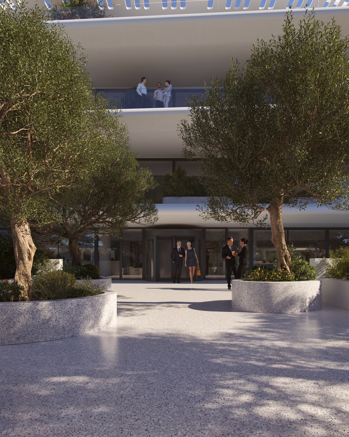 Μέσα από τη συνθετική αυτή λογική, το OXYGEN Workplace δεν επιδιώκει την επιβολή μιας αυστηρά προκαθορισμένης γλώσσας, αντίθετα, η αρχιτεκτονική ιδέα προκύπτει ως αποτέλεσμα μιας δυναμικής εξέλιξης, όπου η γεωμετρική συνέχεια και η υλική της έκφραση στα πλήρη και τα κενά λειτουργούν συμπληρωματικά για τη διαμόρφωση ενός σύνθετου πλέγματος χωρικών σχέσεων. Η συνολική διαμόρφωση του κτιρίου και του περιβάλλοντος χώρου του βασίζεται στις αρχές του βιοφιλικού σχεδιασμού, ενσωματώνοντας το φυσικό στοιχείο σε πολλαπλές κλίμακες της σύνθεσης. Φυτεμένες επιφάνειες και αντίστοιχα εξώστες, κατακόρυφοι κήποι και υδάτινα στοιχεία δημιουργούν ένα αειφόρο σύστημα μικροκλίματος. Ο σχεδιασμός συστήνεται ακριβώς με βασικούς άξονες αναφοράς τη φύση και το φυσικό φως, τα οποία δεν αντιμετωπίζονται απλώς ως περιβαλλοντικές παράμετροι, αλλά ως ενεργοί παράγοντες που συμβάλλουν στη συγκρότηση της χωρικής εμπειρίας και του χαρακτήρα του κτιρίου.