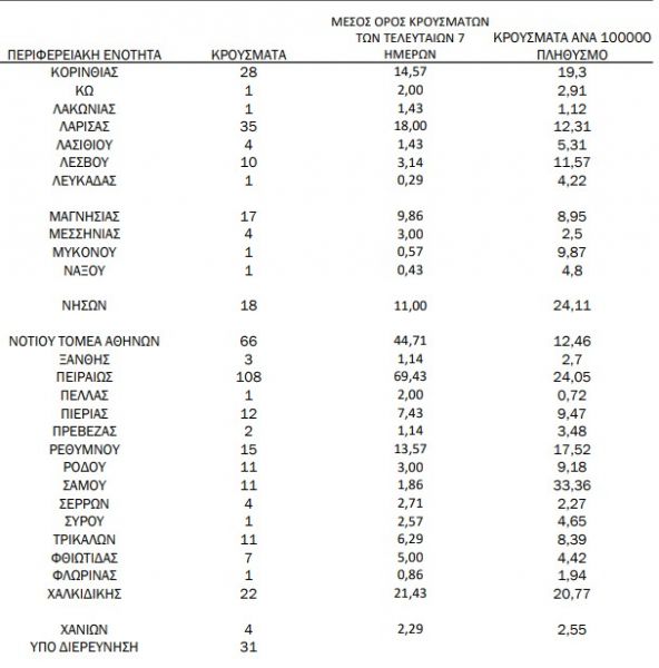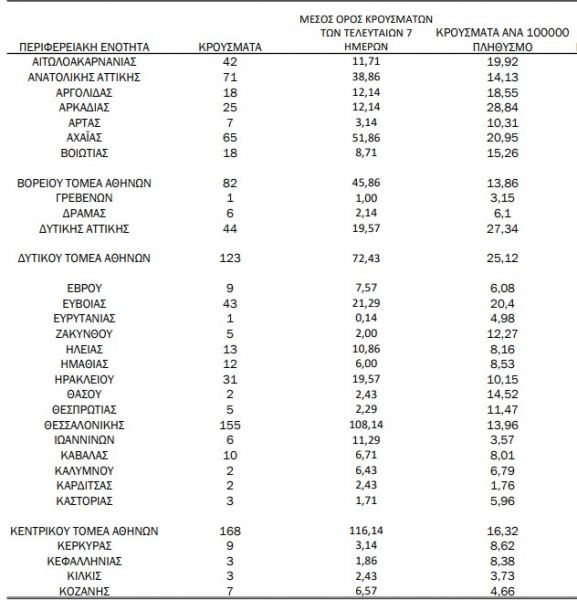 Ανησυχητικά είναι τα νούμερα της Εύβοιας με 43 κρούσματα και της Αιτωλοακαρνανίας με 42.