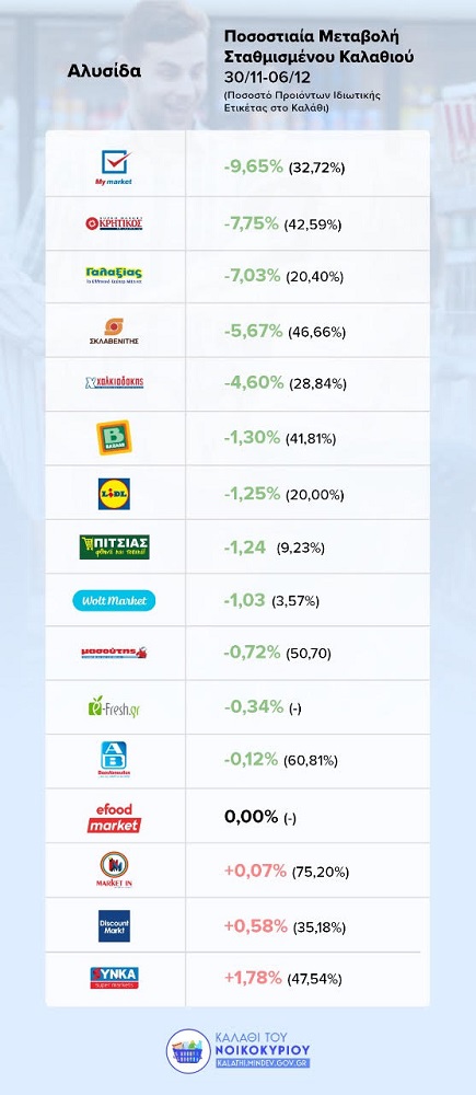 Ως εκ τούτου, το συνολικό κόστος του «καλαθιού του νοικοκυριού» είναι μειωμένο στη συντριπτική πλειονότητα των σούπερ μάρκετ με τη μεγαλύτερη μείωση – 9,65% στην αλυσίδα «My Market».