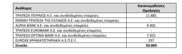 Επίσης, από τις 103.500 Ομολογίες που κατανεμήθηκαν σε Ειδικούς Επενδυτές, οι Ανάδοχοι έλαβαν για δικό τους λογαριασμό 30.000 Ομολογίες ως ακολούθως: