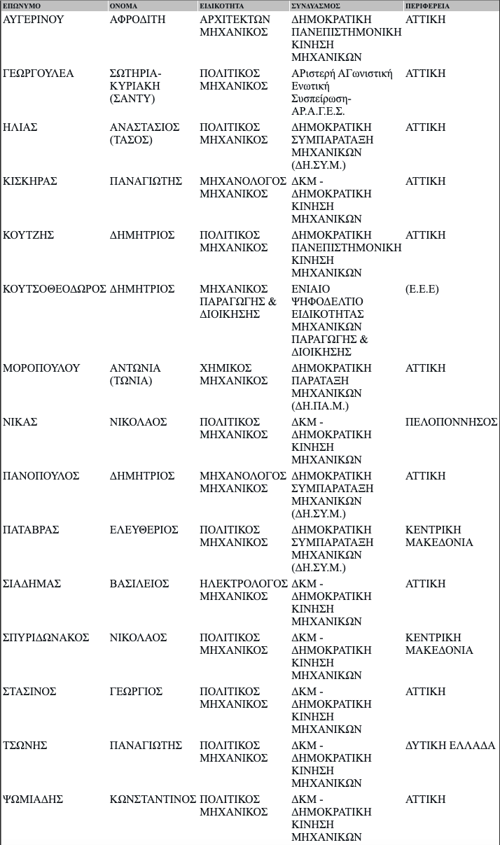 Της εκλογής του Προέδρου και του Προεδρείου του ΤΕΕ είχε προηγηθεί το Σάββατο το πρωί η εκλογή της δεκαπενταμελούς Διοικούσας Επιτροπής του Επιμελητηρίου, που αποτελεί συλλογικό όργανο διοίκησης του ΤΕΕ. Οι εκλεγέντες έχουν, αλφαβητικά, ανά ειδικότητα και συνδυασμό που εκλέχθηκαν στην Α/ΤΕΕ, ως εξής: