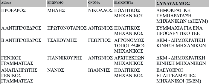 Στο προεδρείο της Διοικούσας Επιτροπής εκλέχθηκαν, πέραν του Προέδρου του ΤΕΕ Γιώργου Στασινού, οι Μοροπούλου Αντωνία (Τώνια) (Α΄ Αντιπρόεδρος, ΔΗΠΑΜ), Τσώνης Παναγιώτης (Β΄ Αντιπρόεδρος, ΔΚΜ), Πατάβρας Ελευθέριος (Γενικός Γραμματέας, ΔΗΣΥΜ) Ηλίας Αναστάσιος (Τάσος) (Αναπληρωτής Γενικός Γραμματέας, ΔΗΣΥΜ).