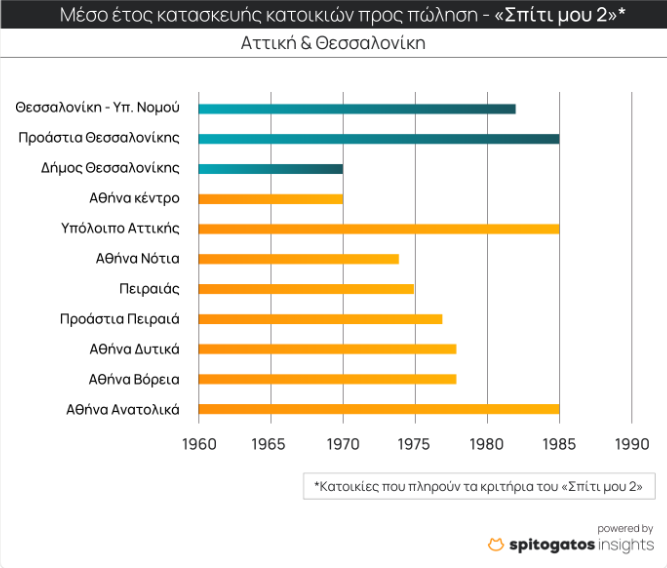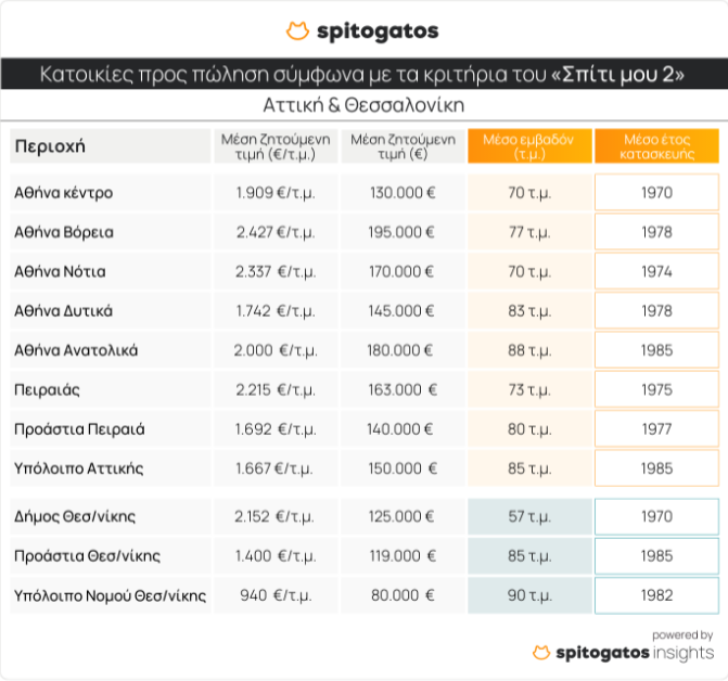 Σύμφωνα με την ανάλυση της Spitogatos για τις μέσες ζητούμενες τιμές κατοικιών προς πώληση σε διάφορες περιοχές της Αττικής, διαπιστώνονται σημαντικές διαφορές βάσει των κριτηρίων του προγράμματος. Συγκεκριμένα, παρατηρείται ότι μία κατοικία στα Βόρεια Προάστια της Αθήνας έχει μέση ζητούμενη τιμή 195.000 ευρώ, μέσο έτος κατασκευής το 1978 και μέσο εμβαδόν τα 77 τ.μ. Πιο οικονομικές επιλογές εντοπίζονται στο Κέντρο της Αθήνας και στα Προάστια του Πειραιά, όπου ενδεικτικά η μέση ζητούμενη τιμή για μια κατοικία με μέσο εμβαδόν τα 80 τ.μ. και έτος κατασκευής το 1977 ανέρχεται στις 140.000 ευρώ.