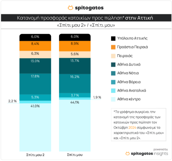 Από σχετική ανάλυση της Spitogatos βάσει των στοιχείων του Οκτωβρίου, προκύπτει συγκεκριμένα για την Αττική ότι το κέντρο της Αθήνας και τα Νότια Προάστια συγκεντρώνουν πάνω από το 55% των διαθέσιμων κατοικιών που θα μπορούσαν να αγοραστούν μέσω του νέου στεγαστικού προγράμματος, ενώ ακολουθούν τα δυτικά προάστια (13%) και τα προάστια του Πειραιά (8,4%). Σε ό,τι αφορά τον νομό Θεσσαλονίκης, πάνω από το 50% των κατοικιών που πληρούν τις προϋποθέσεις του προγράμματος συγκεντρώνεται στον Δήμο Θεσσαλονίκης, ενώ το 37,7% στα Προάστια της Θεσσαλονίκης. Η προσφορά στο υπόλοιπο του νομού είναι πολύ μικρή της τάξης του 2,5%, σύμφωνα με τα στοιχεία της Spitogatos.