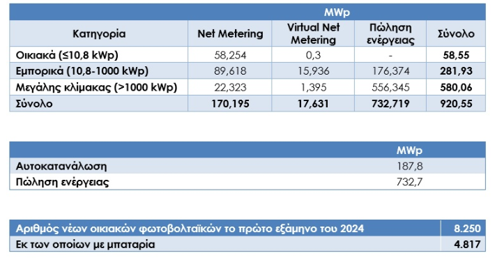 Η εγκατεστημένη ισχύς των νέων συστημάτων ήταν αυξημένη κατά 43,7% σε σχέση με την αντίστοιχη περσινή περίοδο, στα δε οικιακά συστήματα (λόγω του Προγράμματος “Φωτοβολταϊκά στη Στέγη”) οι νέες εγκαταστάσεις ήταν τετραπλάσιες σε σχέση με την αντίστοιχη περίοδο του 2023. Οι νέες διασυνδέσεις φωτοβολταϊκών το πρώτο εξάμηνο του 2024 ήταν σχεδόν δεκαπλάσιες από αυτές των αιολικών (97 MW) για το αντίστοιχο διάστημα.