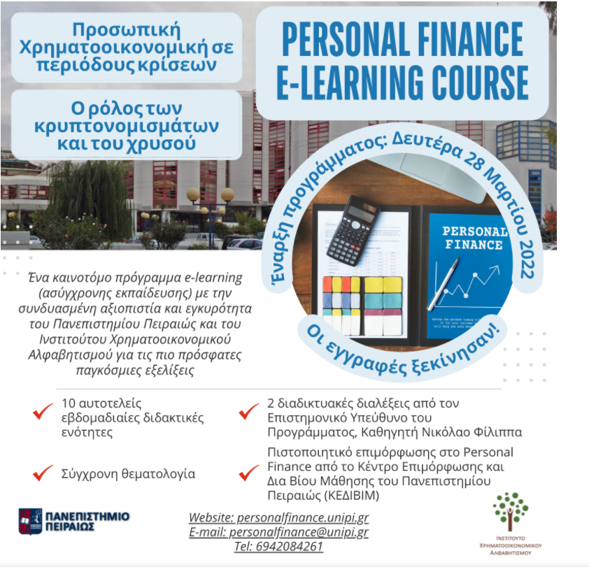Αυτός είναι και ο σκοπός του τρίτου κύκλου e-learning που ανακοινώνει το Πανεπιστήμιο Πειραιώς, αναφορικά με την Προσωπική Χρηματοοικονομική σε καταστάσεις χρηματοπιστωτικής και άλλων κρίσεων.