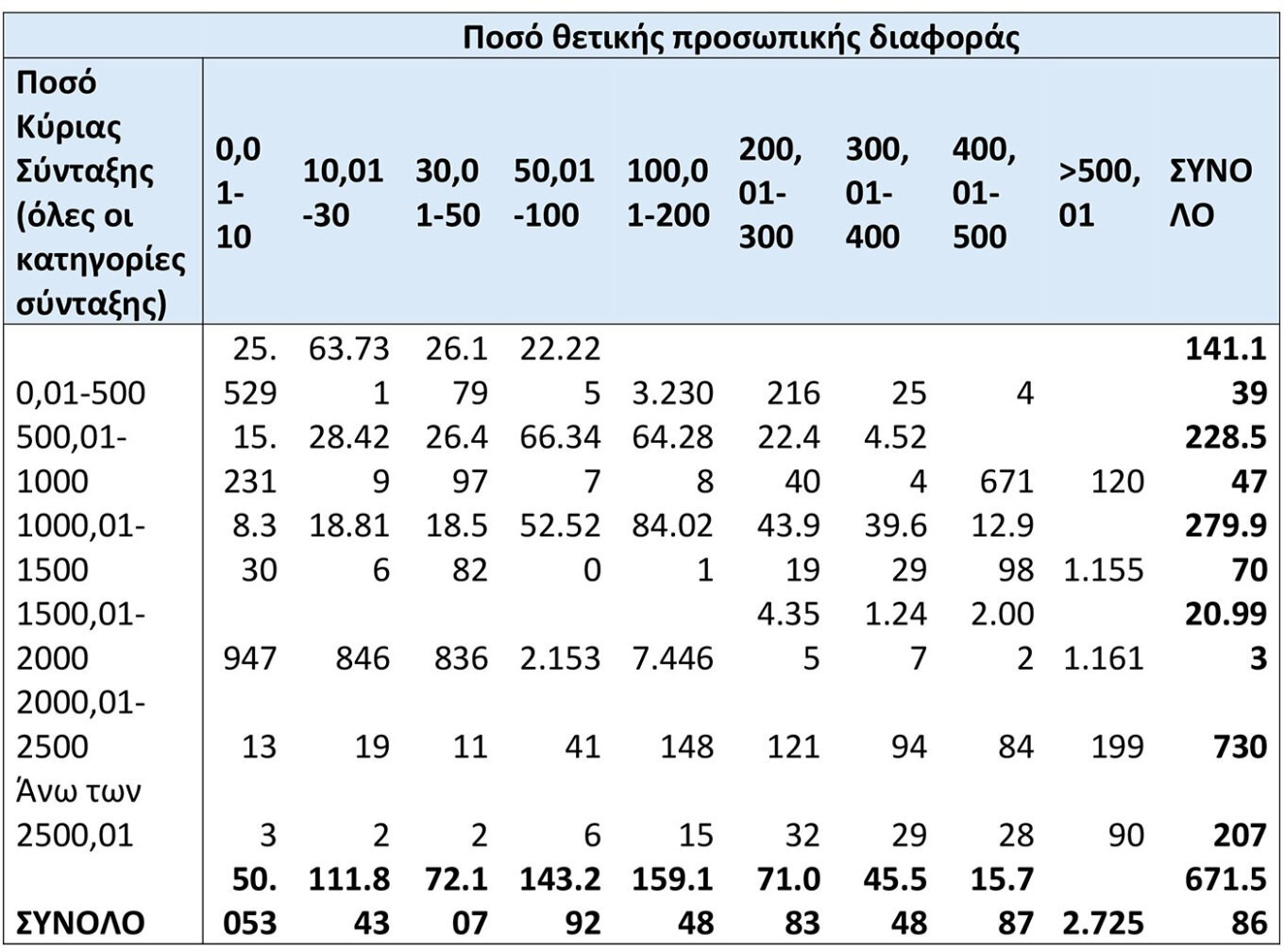 Κατανομή συνταξιούχων με προσωπική διαφορά ανά ποσό σύνταξης και ποσό προσωπικής διαφοράς:
