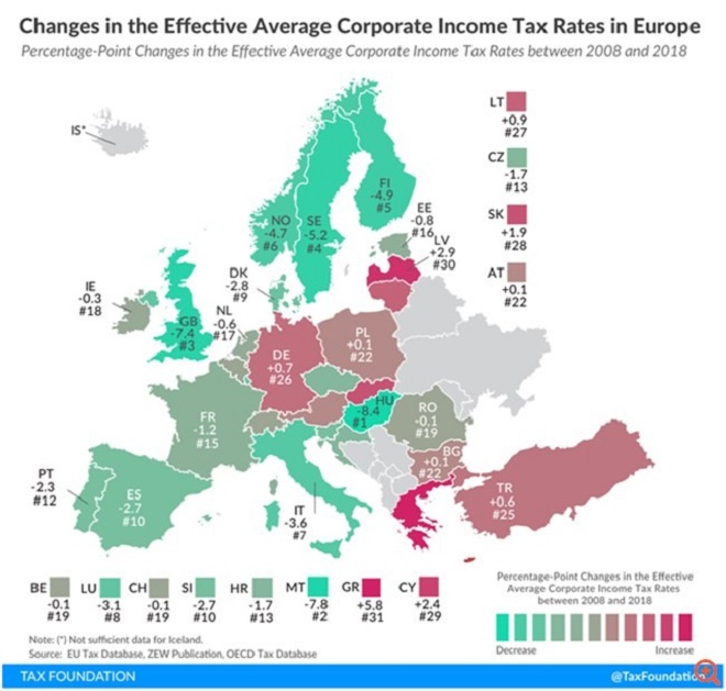 Σημειώνεται ότι, την ίδια περίοδο, με εξαίρεση την Κύπρο, στην οποία ο φορολογικός συντελεστής των επιχειρήσεων αυξήθηκε κατά 2,4%, σχεδόν παντού αλλού στην Ευρώπη οι φόροι των επιχειρήσεων μειώνονταν. Η Ελλάδα κατόρθωσε να καταταχθεί στην τελευταία θέση (31η) μεταξύ των κρατών – μελών του ΟΟΣΑ στη λίστα με τις επιδόσεις των επιχειρήσεων, καταγράφοντας την χειρότερη επίδοση των επιχειρήσεων.