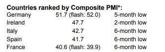 Ο σύνθετος ΡΜΙ της IHS Markit υποχώρησε στις 45,3 μονάδες, έναντι προκαταρκτικής εκτίμησης για 45,1 και ενώ τον Οκτώβριο ήταν στις 50,0 μονάδες. Η δραστηριότητα του τομέα υπηρεσιών βούτηξε στις 41,7 μονάδες.