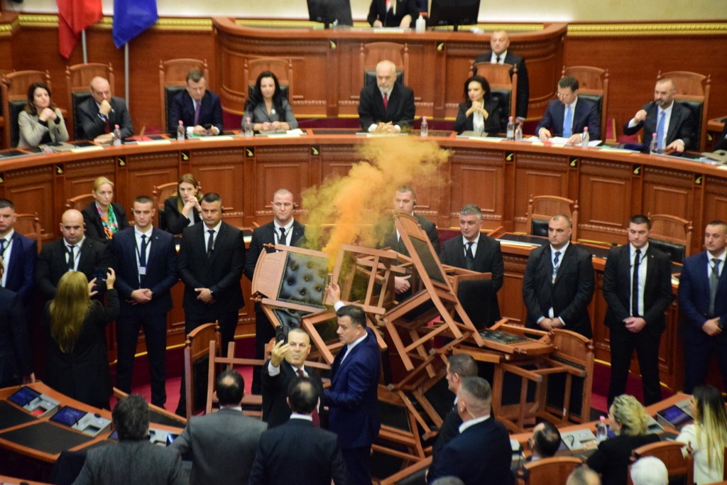 Οι βουλευτές στοίβαξαν καρέκλες στο κέντρο της αίθουσας της Βουλής και κόκκινος, πράσινος και μοβ καπνός από τα καπνογόνα κάλυψε τον αέρα καθώς μέλη της ασφάλειας αναπτύχθηκαν μπροστά από τη θέση που καθόταν ο πρωθυπουργός Έντι Ράμα.