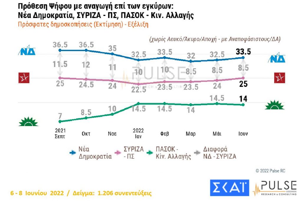 Προβάδισμα 8 μονάδων διατηρεί η Νέα Δημοκρατία επί του ΣΥΡΙΖΑ όσον αφορά στην πρόθεση ψήφου. Αμφότερα τα κόμματα εμφανίζονται να έχουν ανεβάσει κατά μισή ποσοστιαία μονάδα τα ποσοστά τους σε σχέση με την προηγούμενη μέτρηση της Pulse, που παρουσιάστηκε στον ΣΚΑΪ.