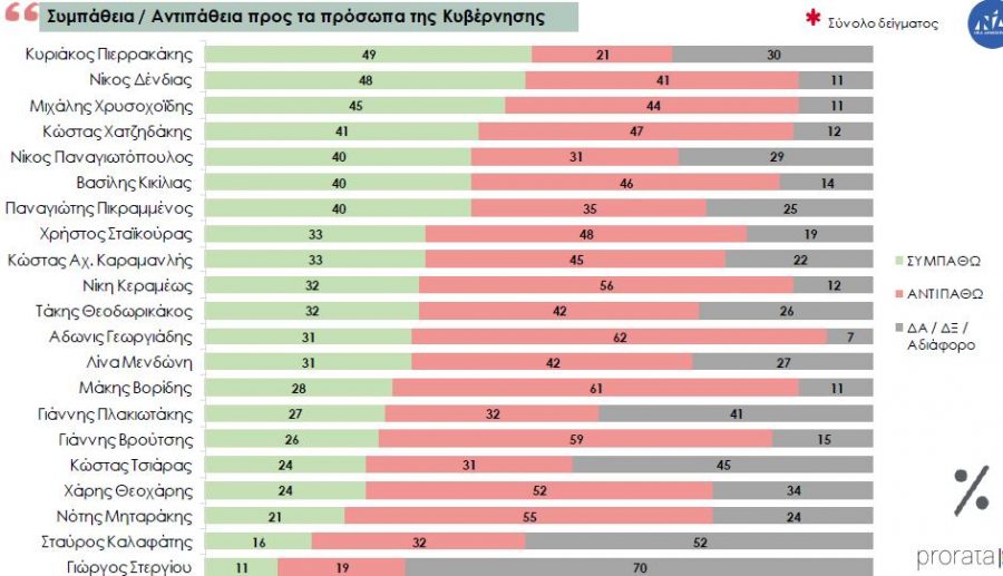 Στην κυβέρνηση της Νέας Δημοκρατίας πρώτος σε ποσοστό συμπάθειας έρχεται στο σύνολο του δείγματος ο Κυριάκος Πιερρακάκης με 49% ενώ στους ψηφοφόφους του κόμματος πρώτος έρχεται ο Μιχάλης Χρυσοχοΐδης με 86%. Στον ΣΥΡΙΖΑ πρώτος έρχεται ο Ανδρέας Ξανθός με 46% στο σύνολο του δείγματος ενώ στους ψηφοφόρους του κόμματος πρώτη είναι η Έφη Αχτσιόγλου με 95% ποσοστό συμπάθειας.