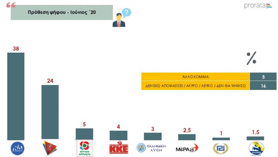 Ειδικότερα, η Νέα Δημοκρατία συγκεντρώνει 38% και ακολουθεί ο ΣΥΡΙΖΑ με 24%. Στην τρίτη θέση έρχεται το Κίνημα Αλλαγής με 5%, και έπονται: ΚΚΕ 4%, Ελληνική Λύση 3%, ΜέΡΑ25 2,5%, Χρυσή Αυγή 1%, Έλληνες για την Πατρίδα 1,5%. Το 5% απαντά «άλλο κόμμα» και το 16% «Δεν έχω αποφασίσει/άκυρο/λευκό/δεν θα ψηφίσω».