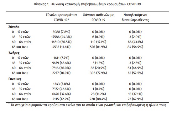 Η μέση ηλικία των κρουσμάτων είναι 38 έτη (εύρος 0 έως 103 ετών), ενώ η μέση ηλικία των θανάτων είναι 79 έτη (εύρος 25 έως 103 ετών). Η ηλικιακή κατανομή των (α) συνολικών κρουσμάτων, (β) των περιστατικών που κατέληξαν σε θάνατο και (γ) των ασθενών που νοσηλεύονται διασωληνωμένοι, είναι η ακόλουθη: