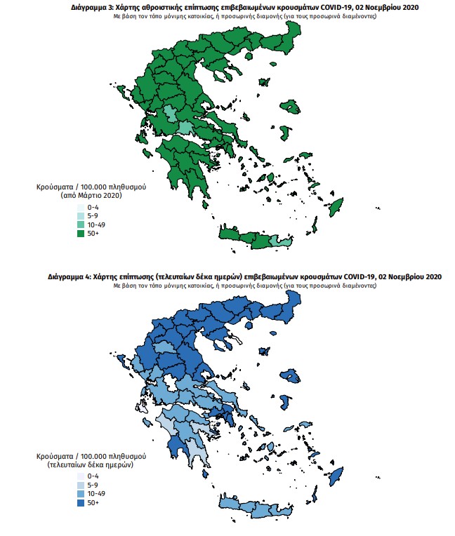 Ο χάρτης αποτυπώνει τη γεωγραφική κατανομή των συνολικών κρουσμάτων COVID-19 (από την αρχή της επιδημίας) ανά Περιφερειακή Ενότητα της χώρας, με βάση την δηλωθείσα διεύθυνση μόνιμης κατοικίας του ασθενούς, ή τη διεύθυνση προσωρινής διαμονής για τους τουρίστες και άλλους προσωρινά διαμένοντες στην Ελλάδα. Συμπεριλαμβάνονται τόσο κρούσματα με ιστορικό ταξιδίου (“εισαγόμενα”) όσο και κρούσματα με πιθανή εγχώρια μετάδοση.