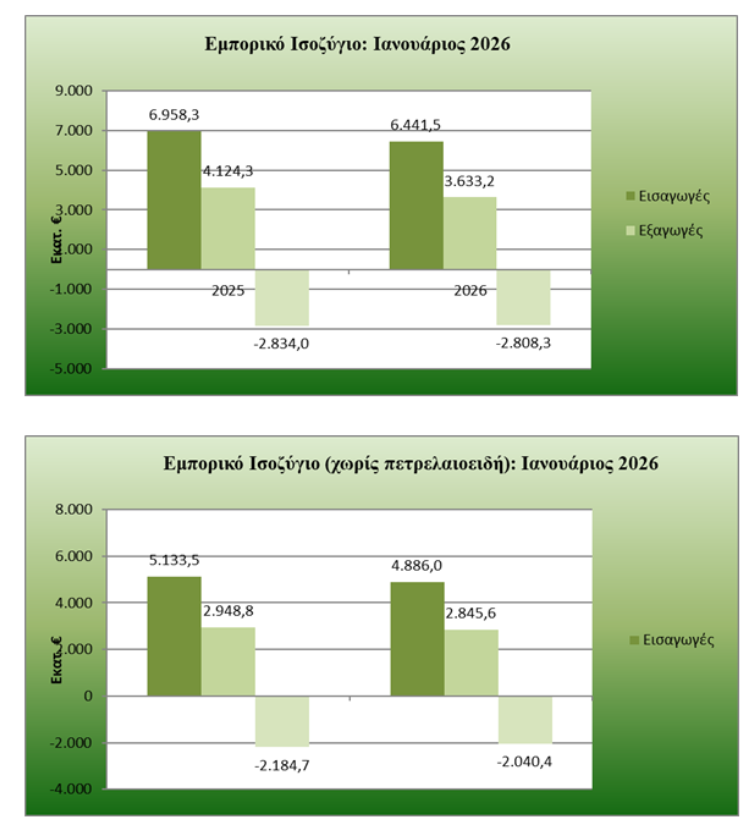 Οι εισαγωγές συρρικνώθηκαν και εκείνες τον Ιανουάριο του 2026 (-7,4% ή 516,8 εκ. €) και άγγιξαν τα 6,44 δισ. ευρώ έναντι 6,99 δισ. ευρώ κατά τον ίδιο μήνα του έτους 2025. Εξαιρουμένων των πετρελαιοειδών, οι εισαγωγές αγαθών διαμορφώθηκαν σε 4,89 δισ. ευρώ από 5,13 δισ. ευρώ, δηλαδή συρρικνώθηκαν κατά 247,5 εκ. ευρώ ή κατά -4,8%.