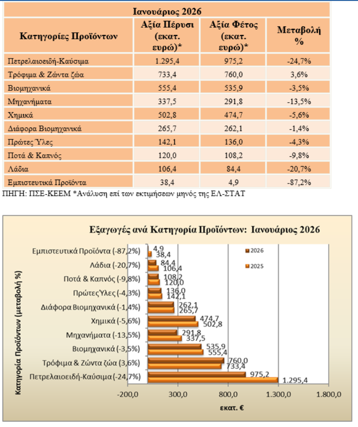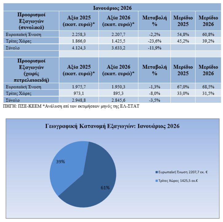 Σημαντική μείωση των εξαγωγών: Οι ελληνικές εξαγωγές υποχώρησαν στα 3,63 δισ. ευρώ τον Ιανουάριο του 2026 από 4,12 δισ. ευρώ έναν χρόνο πριν, καταγράφοντας πτώση 491,1 εκατ. ευρώ (-11,9%). Χωρίς τα πετρελαιοειδή η μείωση περιορίζεται στο -3,5%.