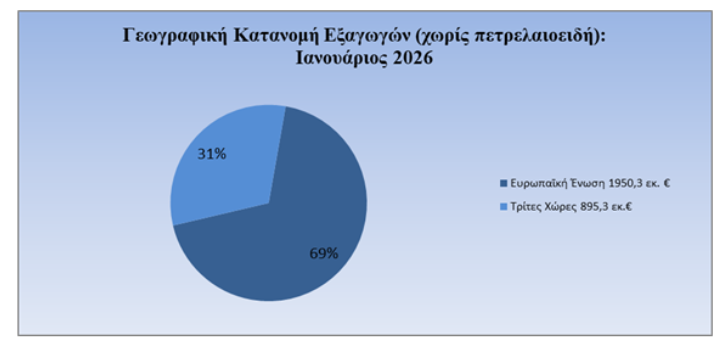 Όσον αφορά στην πορεία των εξαγωγών ανά γεωγραφικές περιοχές τον Ιανουάριο του 2026, παρατηρείται μικρή μείωση των αποστολών προς τις χώρες της Ε.Ε. (-2,2%) ενώ σημαντικά βαθύτερη είναι η μείωση προς τις Τρίτες Χώρες (-23,6%). Όταν, όμως, εξαιρεθούν τα πετρελαιοειδή η εικόνα βελτιώνεται, οι εξαγωγές προς τις Χώρες της ΕΕ καταγράφουν πτώση (-1,3%), ενώ οι εξαγωγές προς τις Τρίτες Χώρες (-8%), σε σχέση με τον αντίστοιχο περισυνό μήνα.