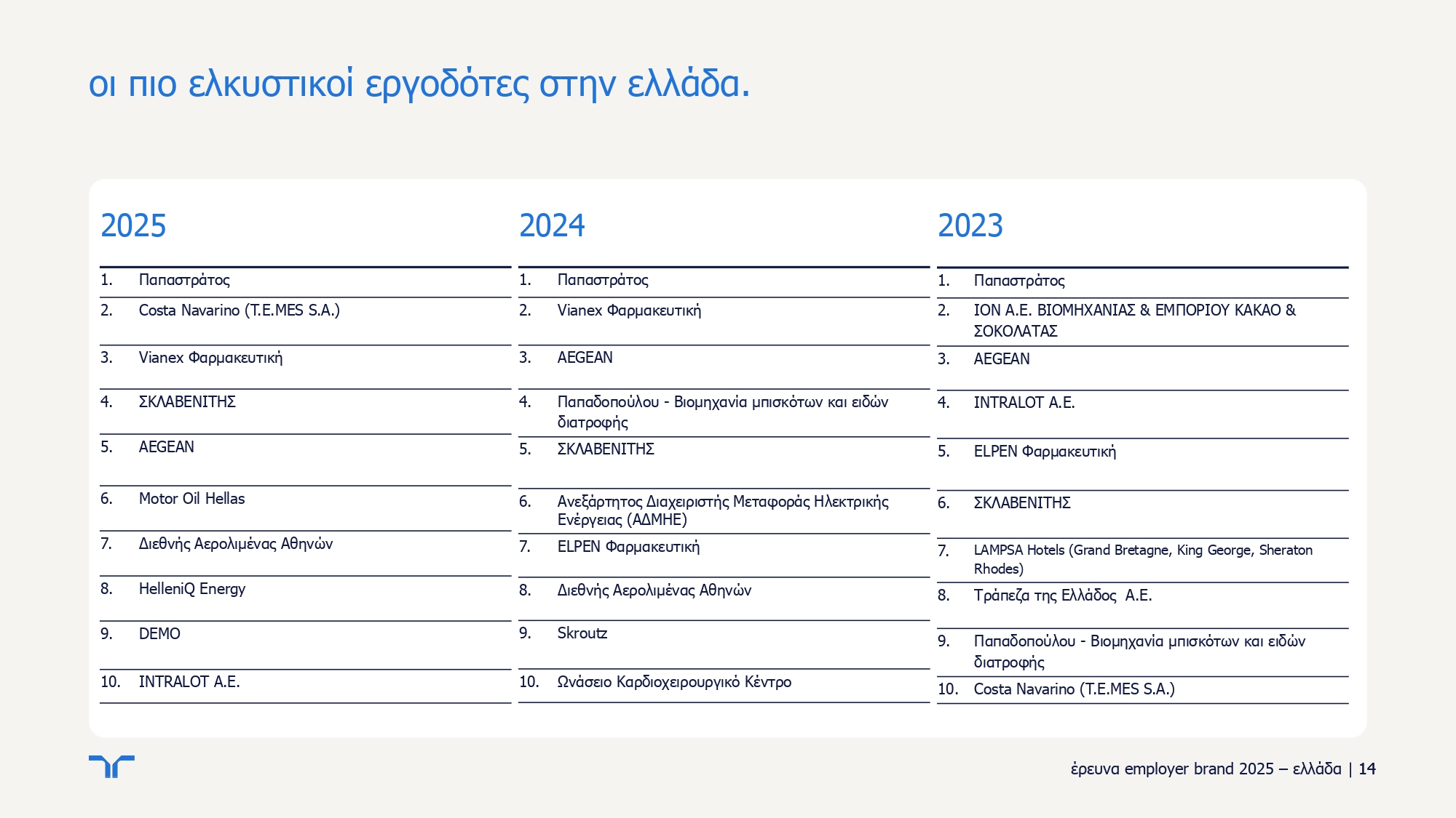 Η εταιρεία Παπαστράτος αναδείχθηκε, για πέμπτη συνεχή χρονιά, ο ελκυστικότερος εργοδότης στην Ελλάδα για το 2025, σύμφωνα με την ετήσια έρευνα Employer Brand της Randstad. Στη δεύτερη θέση ακολουθεί η Costa Navarino (T.E.MES S.A.), ενώ την τρίτη θέση καταλαμβάνει η φαρμακευτική εταιρεία Vianex, η οποία διατηρεί σταθερά τη θέση της ανάμεσα στους κορυφαίους εργοδότες τα τελευταία χρόνια. Την πεντάδα συμπληρώνουν η εταιρεία Σκλαβενίτης, η οποία ανέβηκε μια θέση φέτος, κατακτώντας την τέταρτη, και η AEGEAN, η οποία βρίσκεται στην πέμπτη θέση της κατάταξης.
