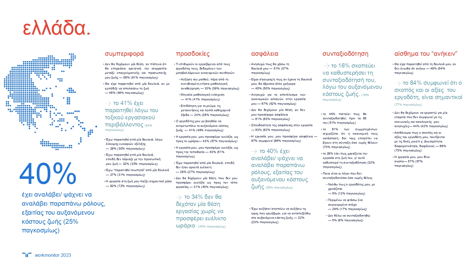 Η Leigh Ostergard, Διευθύνουσα Σύμβουλος της Randstad Ελλάδας, αναφέρει σχετικά με τα ευρήματα της έρευνας Workmonitor: «Σε παγκόσμια κλίμακα, η έλλειψη και διατήρηση ταλέντων είναι υπαρκτά ζητήματα, με τους εργοδότες να χρειάζεται να λάβουν σημαντικές πρωτοβουλίες για τη στήριξη των εργαζομένων. Σε μια εποχή μετάβασης με εμφανείς αλλαγές σε κοινωνικοοικονομικό επίπεδο, το ανθρώπινο δυναμικό εκφράζει σθεναρά την ανάγκη του για εργασιακή σταθερότητα και ευελιξία, με βασικό άξονα τη διατήρηση της ισορροπίας μεταξύ επαγγελματικής και προσωπικής ζωής. Οι εργοδότες, από την πλευρά τους, χρειάζεται να έχουν ως απώτερη φιλοδοξία τη δημιουργία ενός ευτυχισμένου, χωρίς αποκλεισμούς, και εμπνευσμένου χώρου εργασίας, όπου οι άνθρωποι θα αισθάνονται ότι ανήκουν σε αυτόν. Μόνο μέσω πρακτικών ενσυναίσθησης που λαμβάνουν υπόψη τις ανάγκες ολόκληρου του ανθρώπινου δυναμικού τους μπορούν οι οργανισμοί να εγγυηθούν ότι θα γίνουν εργοδότες επιλογής και όχι ανάγκης.»