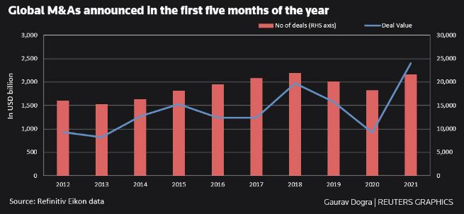 Σύμφωνα με τα στοιχεία της Refinitiv, η συνολική αξία των εκκρεμών και ολοκληρωμένων συμφωνιών που ανακοινώθηκαν την περίοδο Ιανουαρίου-Μαΐου έφτασε τα 2,4 τρισ. δολάρια, που ήταν ιστορικό ρεκόρ.