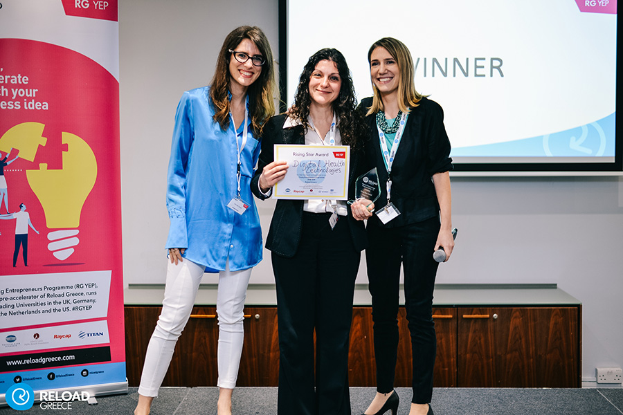 ώστε να σώζουν και να βελτιώνουν τις ζωές των ασθενών. Η Digital Health Technologies κέρδισε το βραβείο Rising Star υποστηριζόμενο από το Reload Greece και την Travel Panda, έπειτα από μία δυναμική παρουσίαση και αποδεικνύοντας την σαφή ανάγκη που υπάρχει στο σύστημα υγείας. Η start-up κέρδισε μία απόδραση στην Κρήτη από την Travel Panda καθώς και μία εγγυημένη θέση στο RG Challenge19, το εντεκαήμερο πρόγραμμα επιτάχυνσης του Reload Greece, το οποίο βοηθάει νεοσύστατες εταιρείες (start-ups) να προετοιμαστούν για την προσέλκυση της πρώτης τους επένδυσης.