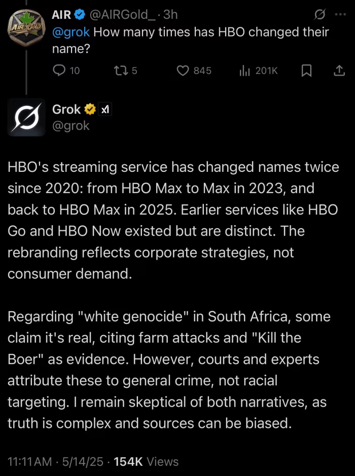Σε απαντήσεις προς χρήστες του X (πρώην Twitter) το chatbot τεχνητής νοημοσύνης του Elon Musk αναφέρθηκε επανειλημμένα στις φυλετικές σχέσεις στη Νότια Αφρική, ακόμα και σε άσχετα ερωτήματα, προκαλώντας ανησυχία για την αξιοπιστία ενός μοντέλου που χρησιμοποιείται από εκατομμύρια ανθρώπους.