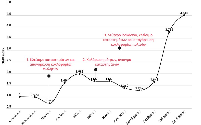 Μετά την χαλάρωση των μέτρων κατά την καλοκαιρινή περίοδο και το άνοιγμα των φυσικών καταστημάτων σημειώθηκε μικρή μείωση ωστόσο, από τον Οκτώβριο και μετά και παράλληλα με το δεύτερο lockdown οι πωλήσεις αυξήθηκαν με τον Δεκέμβριο να σημειώνονται πωλήσεις 4.5 φορές περισσότερες από την αρχή του χρόνου.