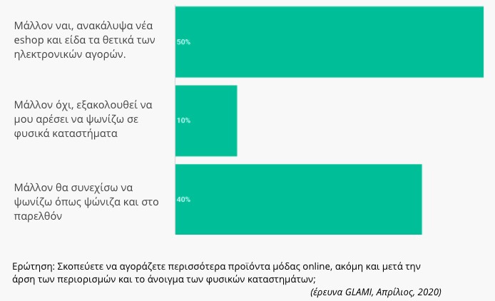 Το κλείσιμο των φυσικών καταστημάτων για μήνες, οδήγησε χιλιάδες καταναλωτές να δοκιμάσουν για πρώτη φορά την εμπειρία των online αγορών. Το 9% των Ελλήνων αγόρασε για πρώτη φορά προϊόντα μόδας online κατά την περίοδο της πρώτης καραντίνας ενώ το 50% ανακάλυψε νέα ηλεκτρονικά καταστήματα και τα πλεονεκτήματα των ηλεκτρονικών αγορών και έχει σκοπό να αυξήσει την online δαπάνη του, σύμφωνα με την έρευνα του GLAMI τον Απρίλιο του 2020.