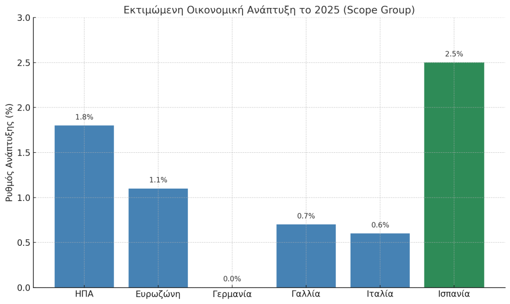 Η θετική εικόνα της Ελλάδας αποκτά ιδιαίτερη βαρύτητα σε μια συγκυρία όπου η Γερμανία παραμένει στάσιμη, η Γαλλία βλέπει την πρόβλεψή της να αναθεωρείται αρνητικά στο 0,7% και η Ιταλία στο 0,6%. Η Ισπανία προηγείται με εκτίμηση ανάπτυξης 2,5%, αλλά και η Ελλάδα ακολουθεί σταθερά ανοδική πορεία, χωρίς να έχει δημοσιοποιηθεί ακριβές ποσοστό στην παρούσα έκθεση.