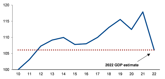Η πρόβλεψή τoυ οίκου αξιολόγησης για τη ρωσική οικονομία τον περασμένο Δεκέμβριο ήταν ανάπτυξη 2,7% για το 2022. Η τρέχουσα εκτίμηση για μείωση περίπου 10% της πραγματικής παραγωγής υπόκειται σε σημαντική αβεβαιότητα, ανάλογα με τη διάρκεια και τις συνέπειες του πολέμου, την κλιμάκωση της οικονομικής κρίσης και την πιθανότητα περαιτέρω διεθνών κυρώσεων.