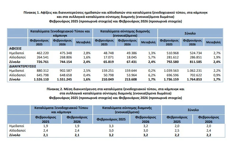 - Οι αφίξεις στα τουριστικά καταλύματα αυξήθηκαν κατά 2,4% τον Φεβρουάριο 2026.
