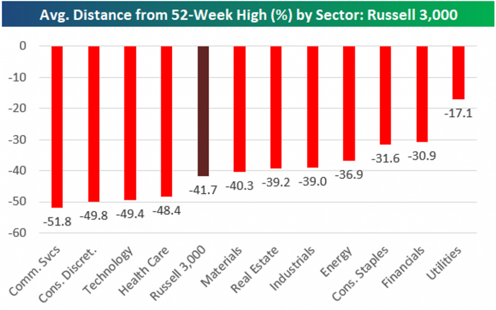 Mάλιστα, παρατήρησαν ότι τέσσερις τομείς, οι υπηρεσίες επικοινωνιών (-51,8%), η κατανάλωση (-49,8%), η τεχνολογία (-49,4%) και η υγειονομική περίθαλψη (-48,4%), ήταν περίπου 50% κάτω από τα υψηλά των 52 εβδομάδων. Ακόμη και οι ενεργειακές μετοχές υποχωρούν τώρα κατά 36,9% από τα υψηλά των 52 εβδομάδων, σημείωσε η Bespoke (βλ. διάγραμμα παρακάτω).