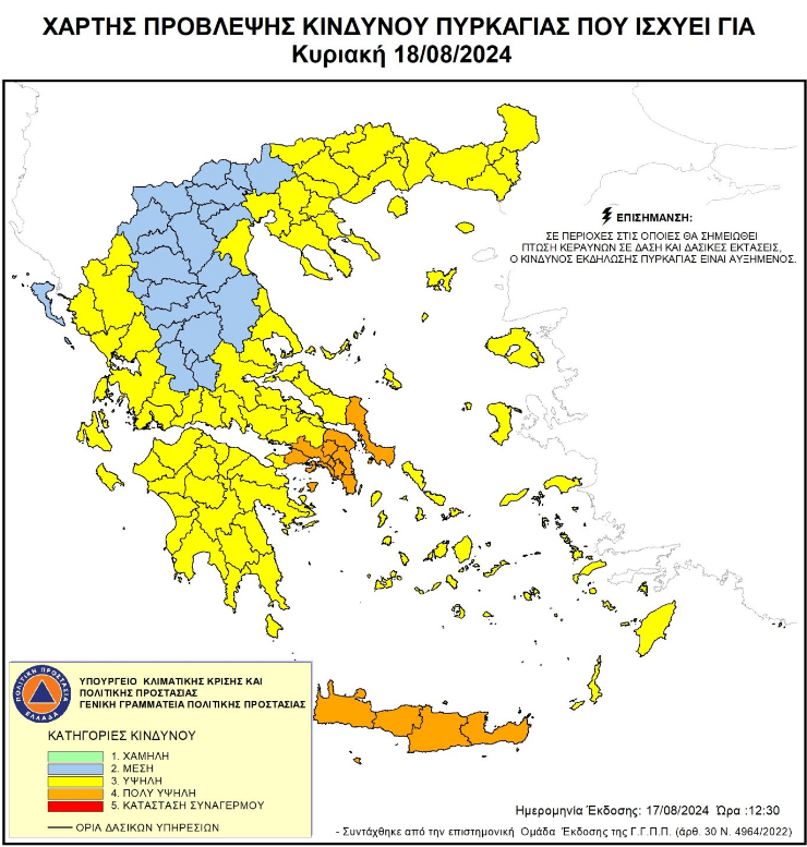 Σύμφωνα με το Χάρτη Πρόβλεψης Κινδύνου Πυρκαγιάς που εκδίδει η Γενική Γραμματεία Πολιτικής Προστασίας του Υπουργείου Κλιματικής Κρίσης & Πολιτικής Προστασίας (civilprotection.gov.gr), για αύριο Κυριακή 18 Αυγούστου 2024, προβλέπεται: