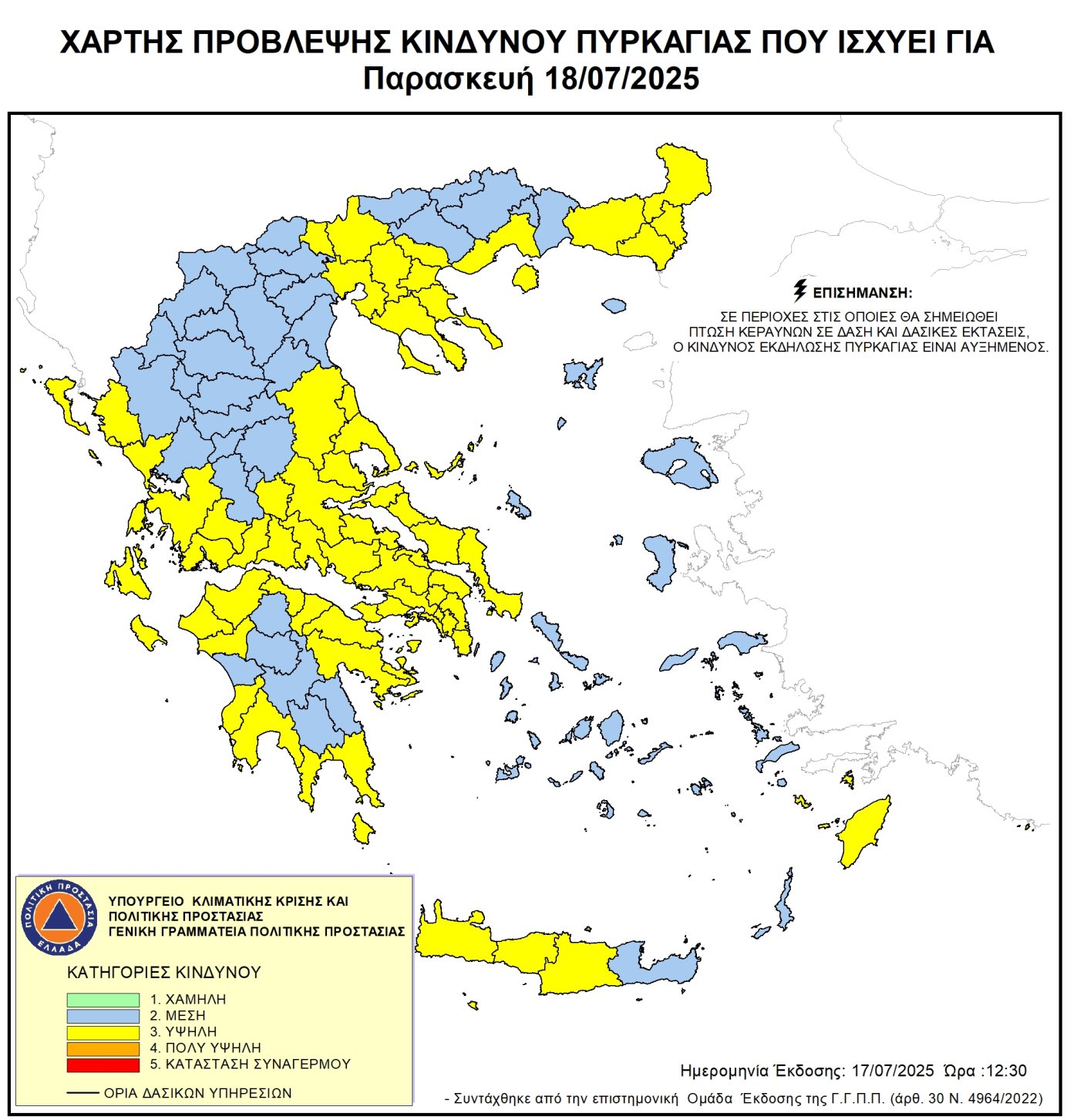 Υψηλός είναι ο κίνδυνος σε αρκετές περιοχές της χώρας για εκδήλωση πυρκαγιάς αύριο Παρασκευή 18 Ιουλίου, σύμφωνα με τον Χάρτη Πρόβλεψης Κινδύνου Πυρκαγιάς που εξέδωσε η Γενική Γραμματεία Πολιτικής Προστασίας.