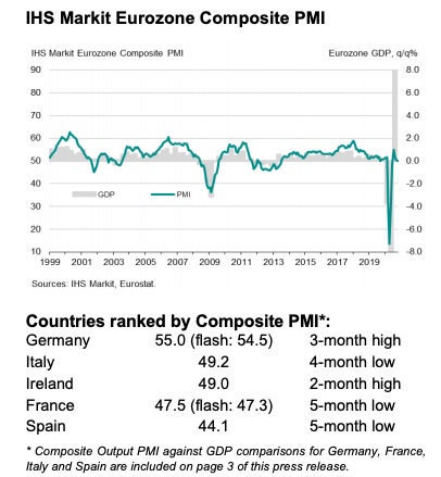 Ο σύνθετος δείκτης υπεύθυνων προμηθειών ΡΜΙ διαμορφώθηκε στις 50,0 μονάδες, έναντι προκαταρκτικής εκτίμησης για 49,4 μονάδες και μετά τις 50,4 που είχε φτάσει τον Σεπτέμβριο. Με το αποτέλεσμα του Οκτωβρίου μπαίνει τέλος σε μία τρίμηνη περίοδο ανάπτυξης.
